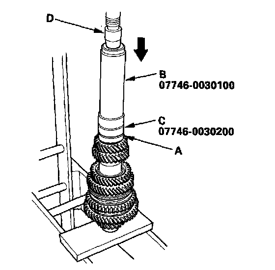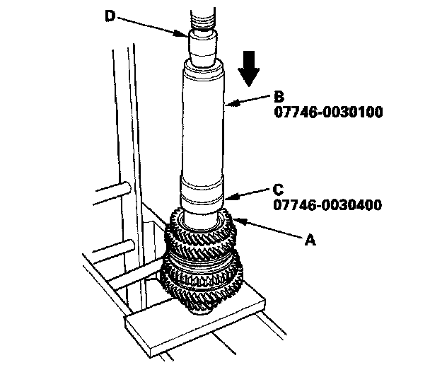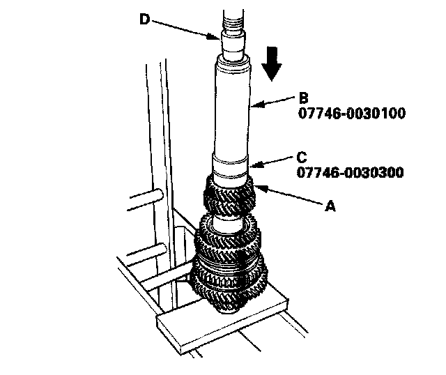 10. Install the 5th gear (A) using the 40 mm I.D. driver (B), 30 mm I.D. attachment (C), and a press (D).