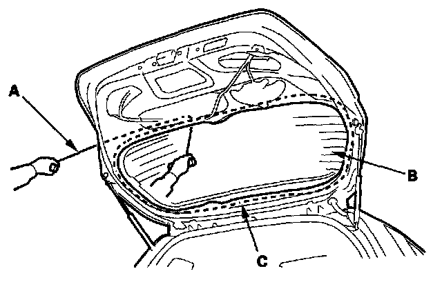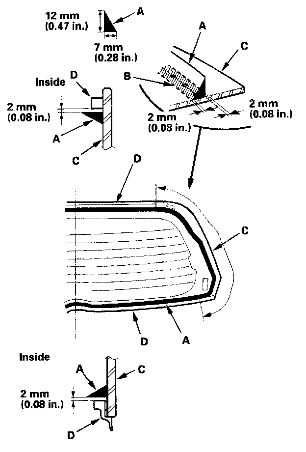 19. Pack adhesive into the cartridge without air pockets to ensure continuous delivery. Put the cartridge in a caulking gun, and run a bead of adhesive (A) on the glass primer trace (B) around the edge of the rear window (C) and along the rubber dams (D) as shown.