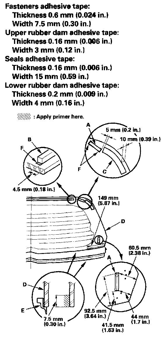 11. Attach the fasteners (A), upper rubber dam (B), and seals (C) with adhesive tape (with tailgate spoiler) to the inside face of the rear window (D) as shown. Attach the lower rubber dam (E) with adhesive tape along the edge of the rear window. Before installing the upper and lower rubber dams, apply primer to the inside face of the rear window.