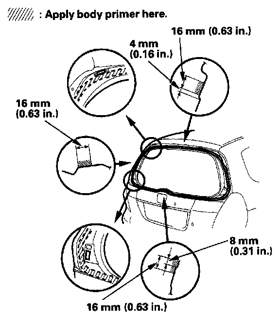 - Never touch the primed surfaces with your hands. If you do, the adhesive may not bond to the rear window properly, causing a leak after the rear window is installed.