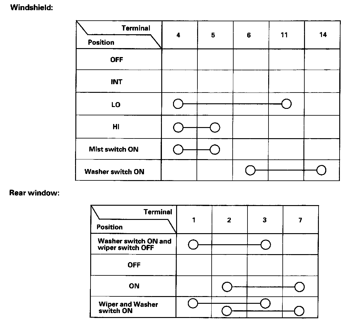 - If the terminals look OK, check for continuity between the terminals in each switch position according to the tables.