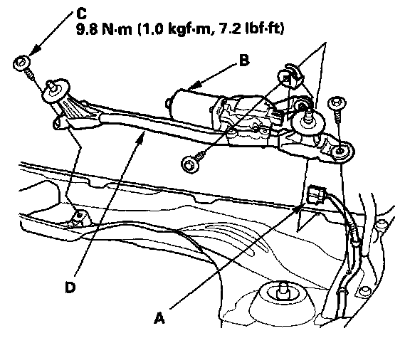 6. Remove the two screws and wiper motor (C) from the wiper linkage (D).