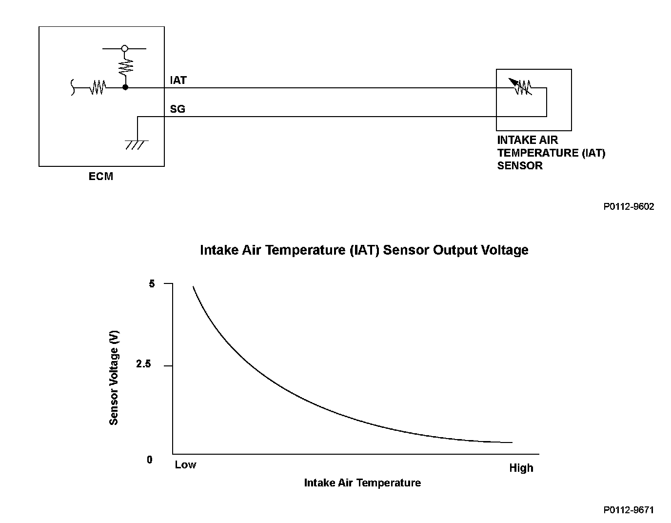 The IAT sensor resistance varies depending on temperature. The output voltage and the sensor resistance increase as the intake air temperature decreases. Conversely, the output voltage and the sensor resistance decrease as the intake air temperature increases. If the IAT sensor output voltage is excessively high, the engine control module (ECM) detects a malfunction and a DTC is stored.