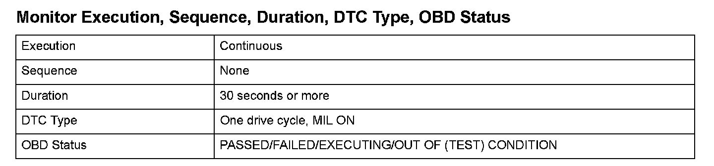 Monitor Execution, Sequence, Duration, DTC Type, OBD Status