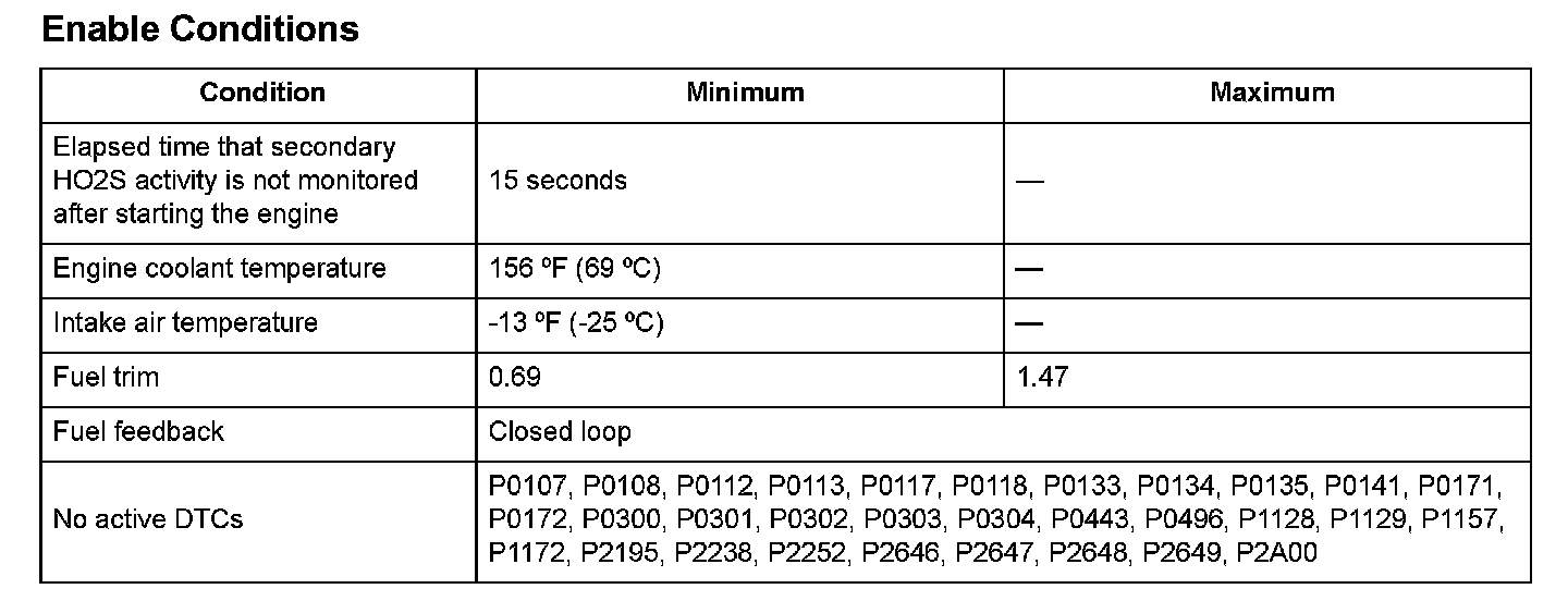 The secondary HO2S output voltage is 0.293 V or less for at least 30 seconds.