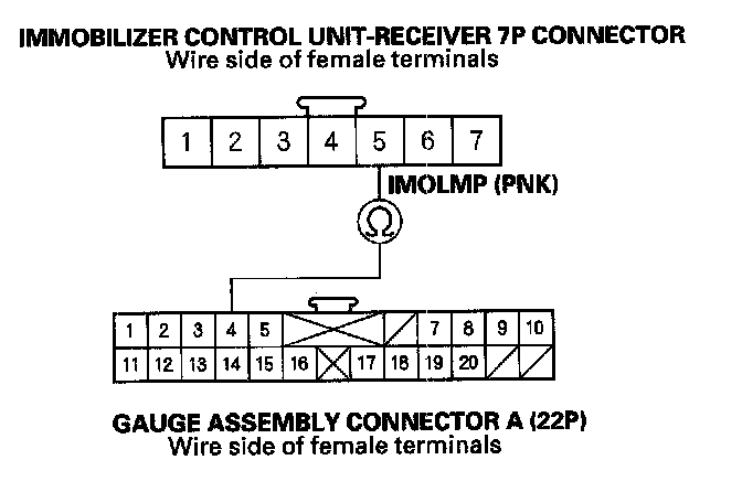 18. Check for continuity between the immobilizer control unit-receiver 7P connector No. 5 (IMOLMP) terminal and gauge assembly connector A (22P) No. 4 terminal.