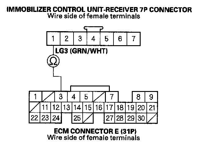 26. Check for continuity between the immobilizer control unit-receiver 7P connector No. 1 (LG3) terminal and ECM connector E (31P) No. 3 (LG3) terminal.