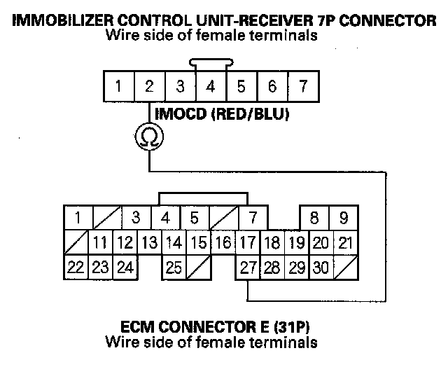 40. Check for continuity between the immobilizer control unit-receiver 7P connector No. 2 (IMOCD) terminal and ECM connector E (31P) No. 27 (IMOCD) terminal.
