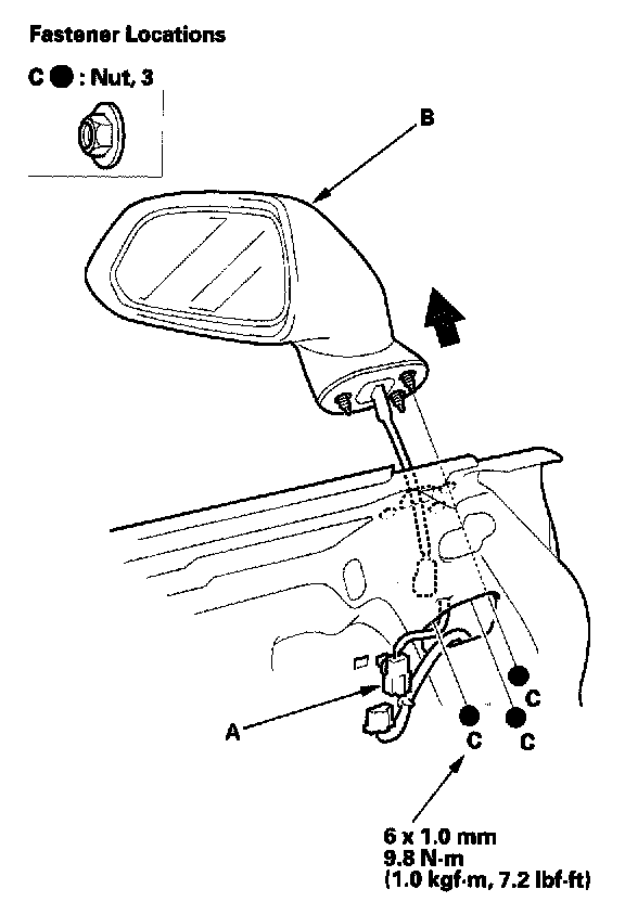 3. Support the mirror (B) with one hand, remove the nuts (C), then remove the mirror.