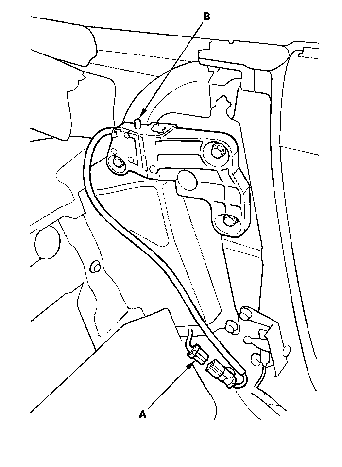 2. Disconnect the 2P connector (A) from the convertible top disable switch (B).