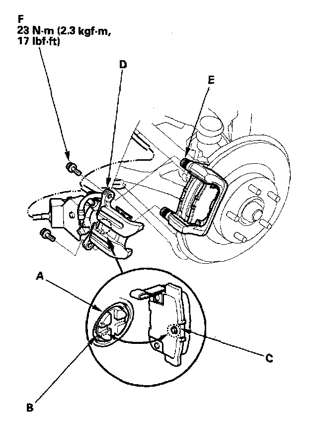 16. Hold the caliper pin (E) with a wrench, being careful not to damage the pin boot. Install the caliper bolts (F) with another wrench, and torque the caliper bolts to the proper specification.
