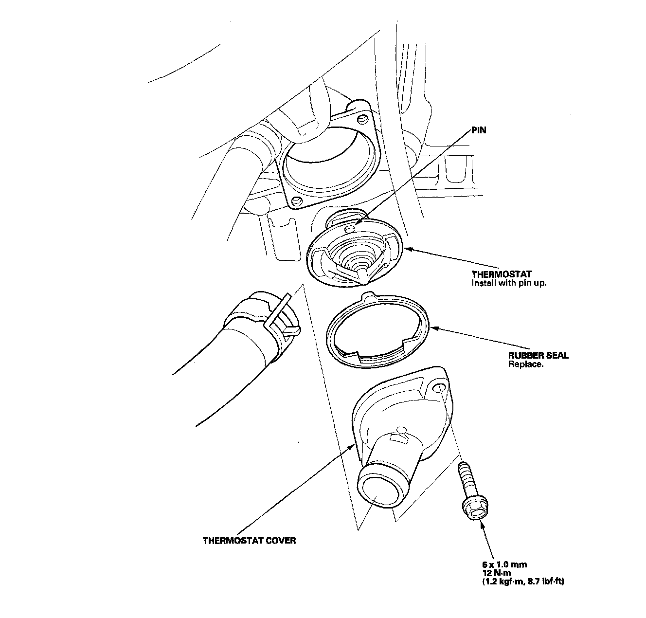 4. Install the thermostat cover and the lower radiator hose.