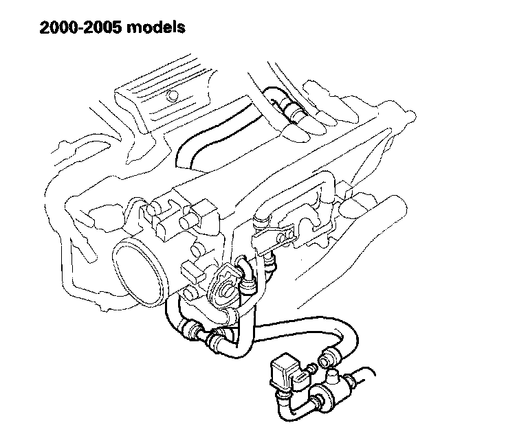 6. 2000-2005 models: Install the brake booster vacuum hose (A), fuel return hose (B) and fuel feed hose (C), using new washers (D).