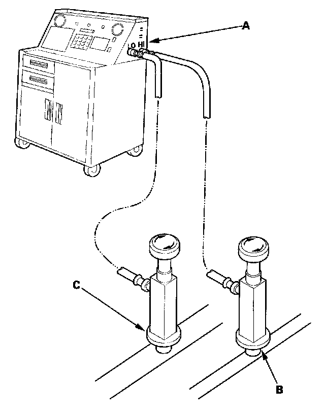 1. Connect a R-134a refrigerant recovery/recycling/charging station (A) to the high-pressure service port (B) and the low-pressure service port (C), as shown, following the equipment manufacturer's instructions.