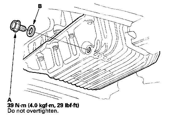 3. Reinstall the drain bolt with a new washer (B).