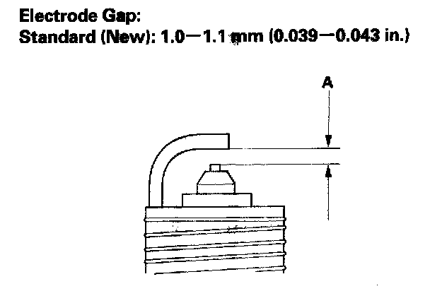 4. Replace the plug at the specified interval, or if the center electrode is rounded (A). Use only the spark plugs listed.
