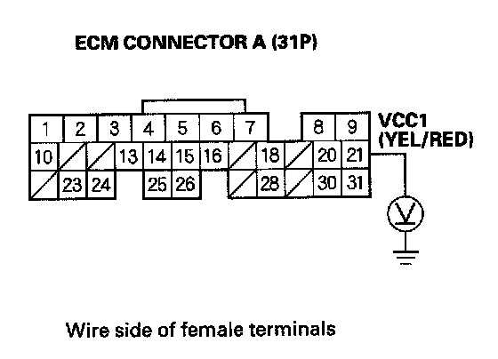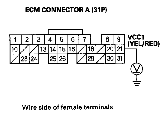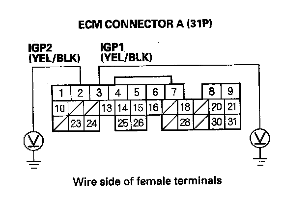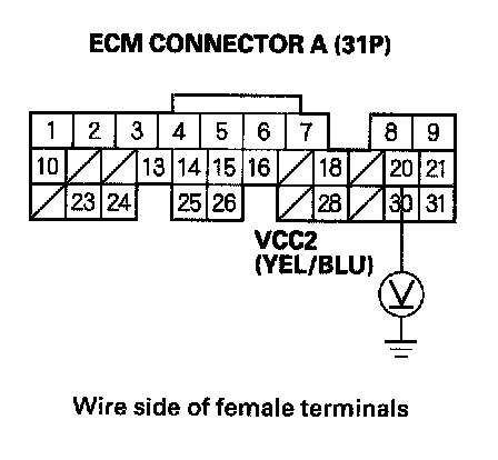 83. Disconnect the connector from each of these sensors, one at a time, and measure voltage between body ground and ECM connector terminal A20 with the ignition switch ON (II).