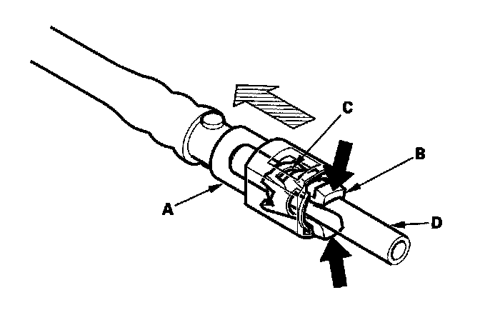 3. Before connecting a new fuel tube/quick-connect fitting assembly (A), remove the old retainer from the mating line.