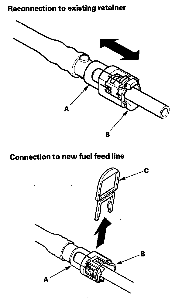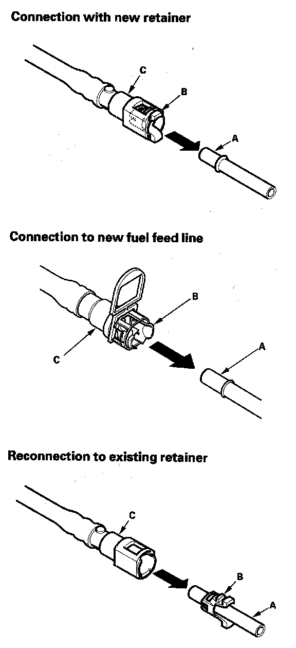 5. When you reconnect the connector (A) with the old retainer, make sure the connection is secure and the tabs (B) are firmly locked into place; check visually and also by pulling the connector. When you replace the fuel line with a new one, make sure you remove the ring pull (C) upwards after you confirm the connection is secure.
