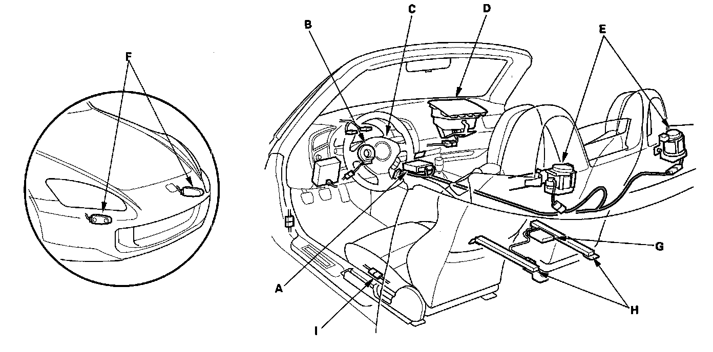 The SRS is a safety device which, when used with the seat belt, is designed to help protect the driver and passenger in a frontal impact exceeding a certain set limit. The system consists of the SRS unit, including safing sensor and impact sensor (A), the cable reel (B), the driver's airbag (C), the passenger's airbag (D), seat belt tensioners (E), front impact sensors (F).