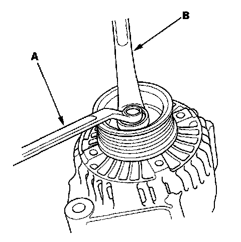 3. If the front bearing needs replacing, remove the pulley locknut with a 10 mm wrench (A) and a 22 mm wrench (B). If necessary, use an impact wrench.