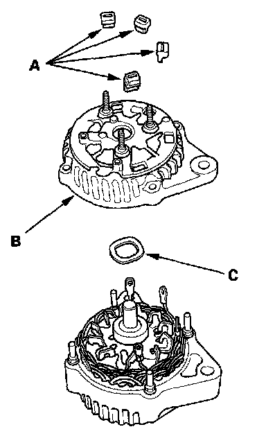 10. Remove the four insulators (A), rear housing (B), and washer (C).