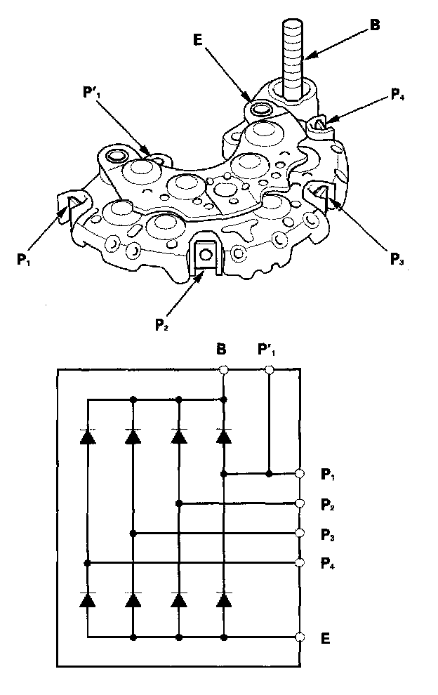 18. Check for continuity in each direction, between the B terminal and P terminals, and between the E terminal and P terminals of each diode pair. All diodes should have continuity in only one direction. Because the rectifier diodes are designed to allow current to pass in one direction, and the rectifier is made up of eight diodes (four pairs), you must test each diode in both directions for continuity with an ohmmeter that has diode checking capability: a total of 16 checks.