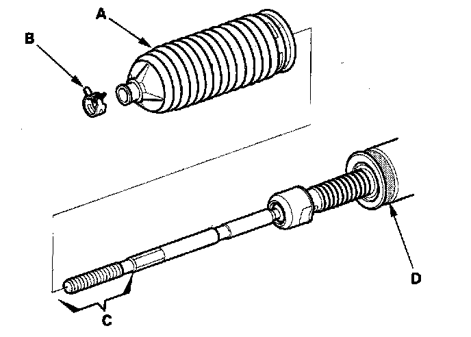 1. Install a new lock washer (A) on the rack shaft. Align the lock washer tabs (B) with slots (C) in the rack shaft. Install the rack end (D) while holding the lock washer in place. Repeat this step for the other side of the rack shaft.