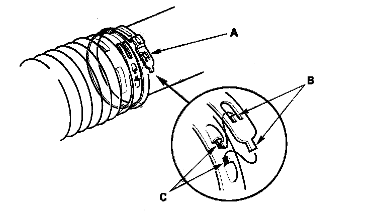 6. Center the steering rack within its stroke. Install the boots (A) in the rack end with the tie-rod clips (B). Clean off any grease or contamination from the groove around (C) on the housing.