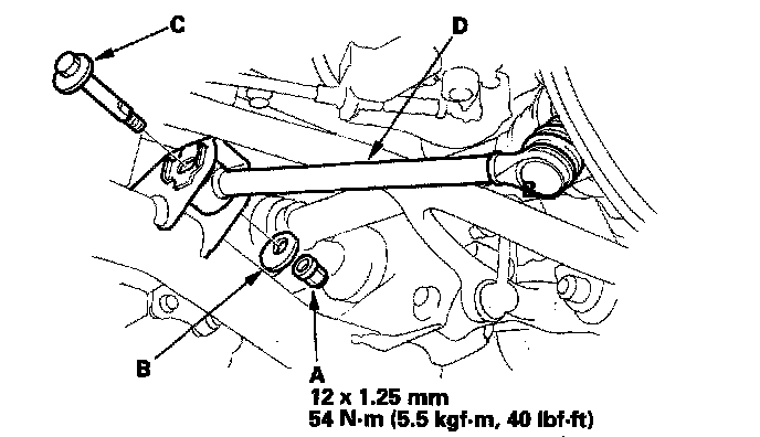 3. Remove the self-locking nut (A), cam plate (B), and adjusting bolt (C), then disconnect the control arm (D) from the frame.