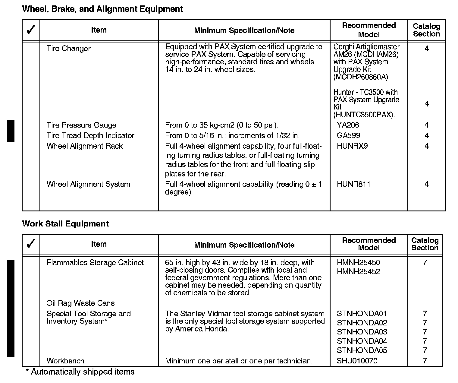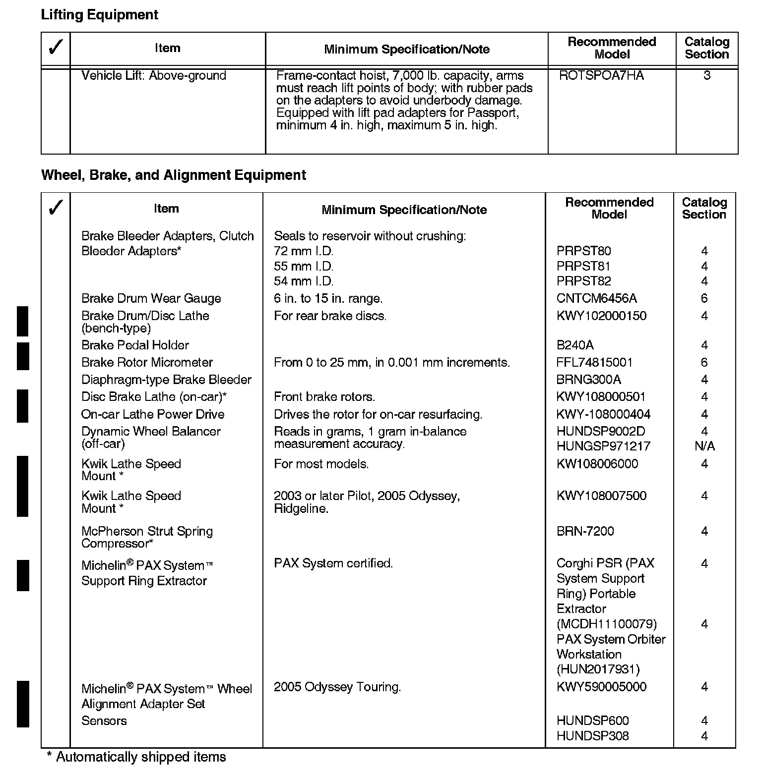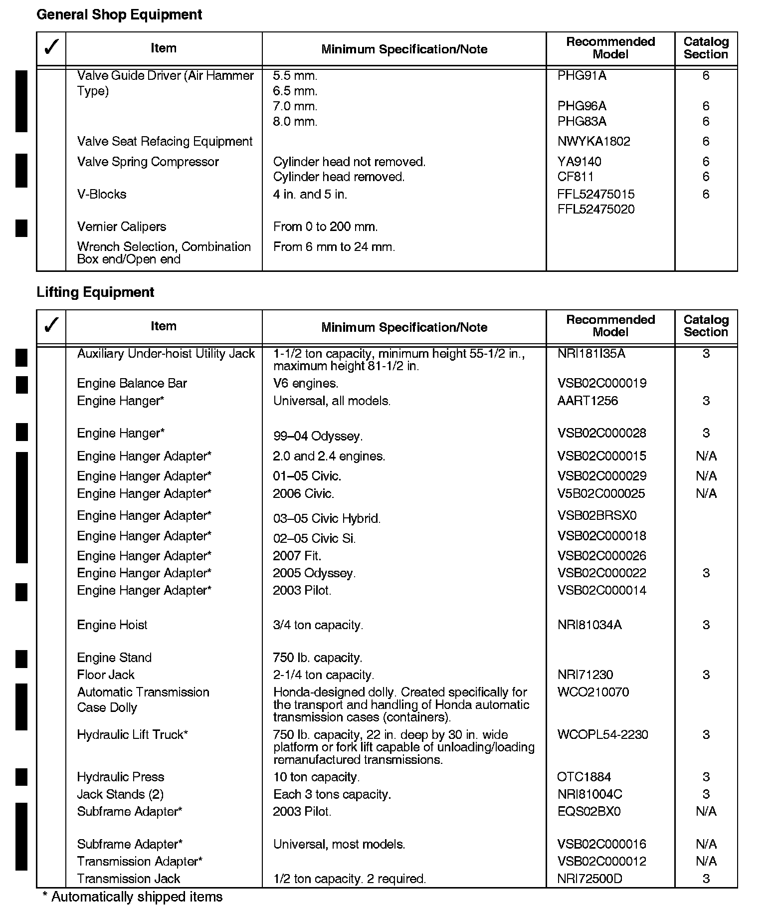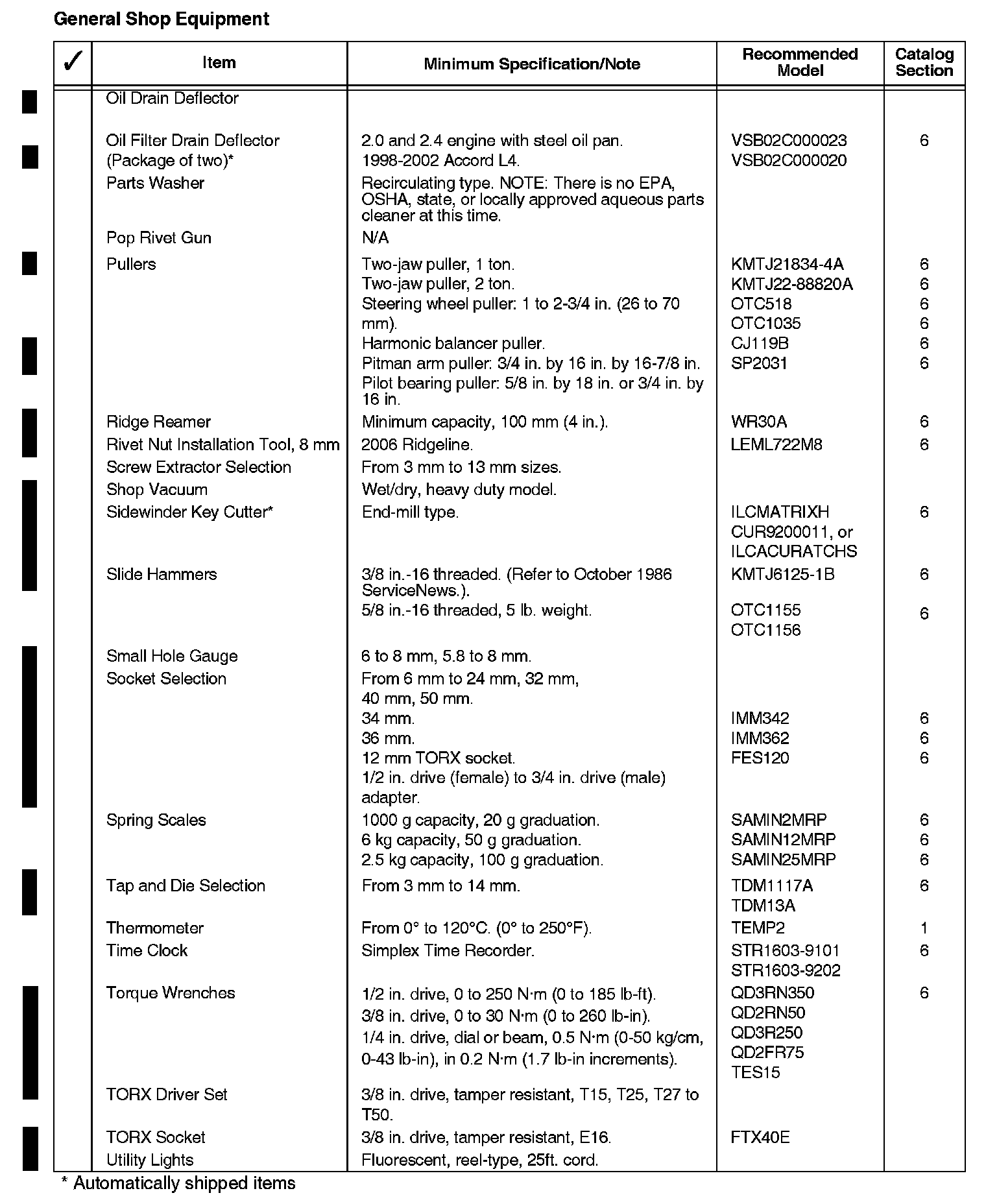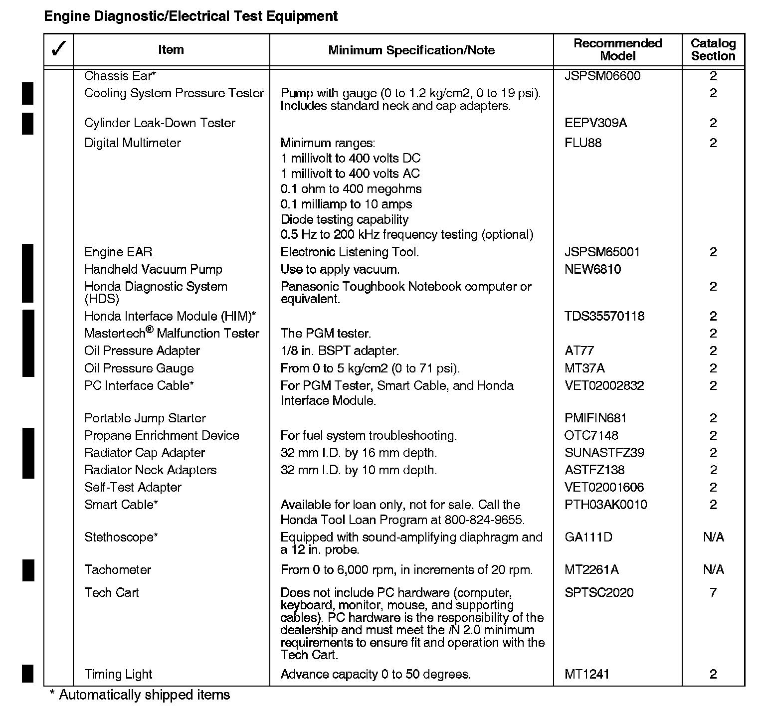 The tools and equipment in the list shown can be purchased through the American Honda Tool and Equipment Program, or from outside sources. The recommended model listed for each item meets the minimum requirements for proper servicing of Honda vehicles. Refer to the American Honda Tool and Equipment Program catalog or the Interactive Network (iN) electronic catalog found under service for equipment details and for information on other models that may be more suitable for your servicing needs.