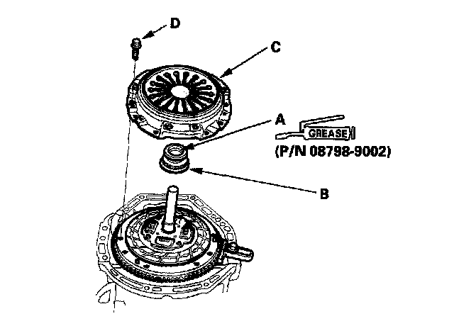 5. Install the pressure plate and the mounting bolts (D), finger-tight. Make sure the release bearing does not come off.