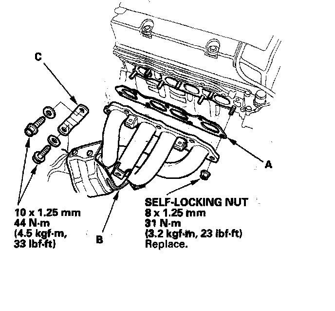 16. Install the gasket (A), exhaust manifold (B), and the exhaust manifold bracket (C).