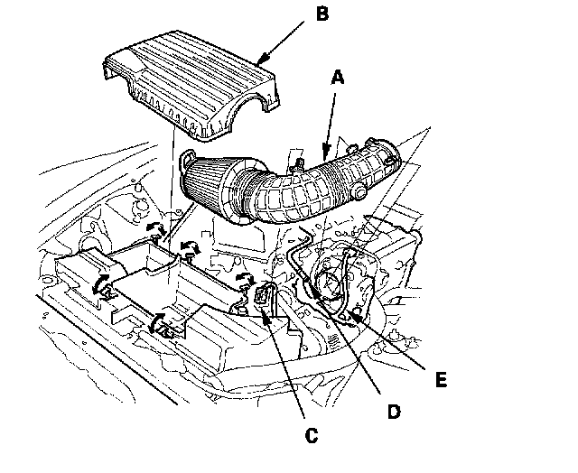 39. 2006 model: Install the air cleaner element assembly (A) and the air cleaner housing cover (B), then connect the IAT sensor connector (C) and breather pipe (D), install the manifold absolute pressure (MAP) sensor harness (E) to the holder.