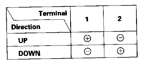 3. Check window motor operation by connecting power and ground according to the table. When the motor stops running, disconnect one lead immediately.