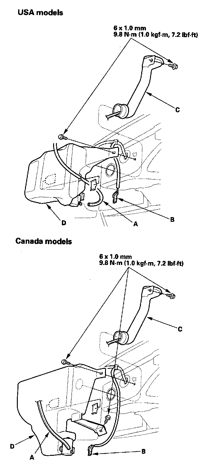 3. Remove the bolts, then separate and remove the filler neck (C) from the washer reservoir (D).