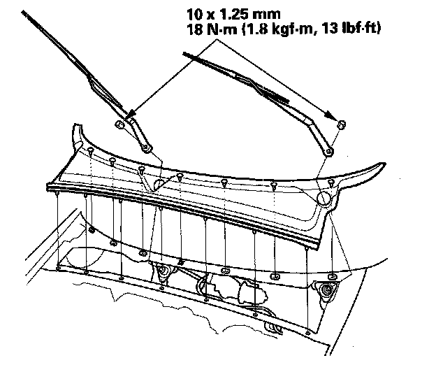 1. Open the hood, and remove the cap nuts and the wiper arms.
