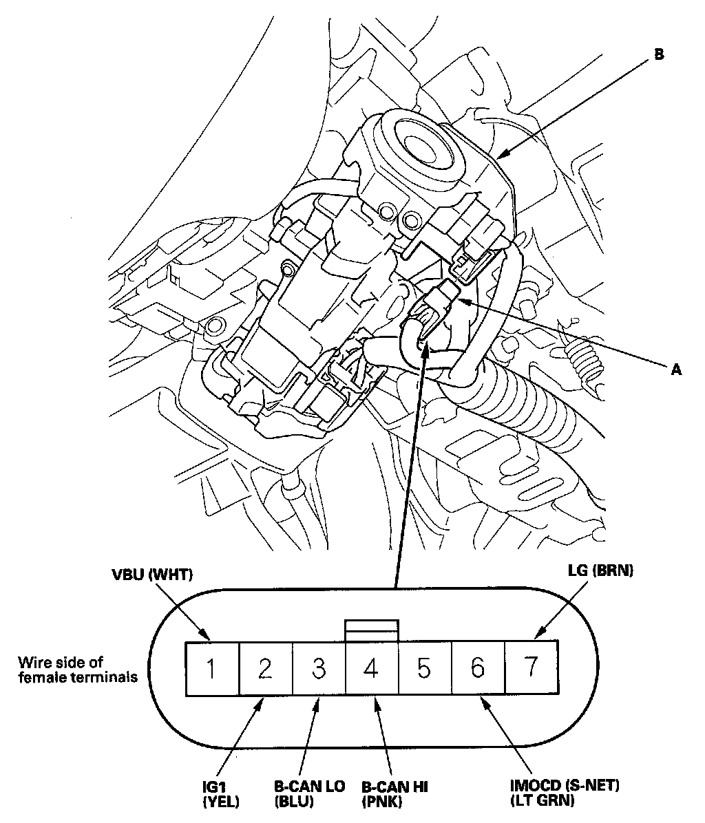 3. Disconnect the 7P connector (A) from the immobilizer-keyless control unit (B).