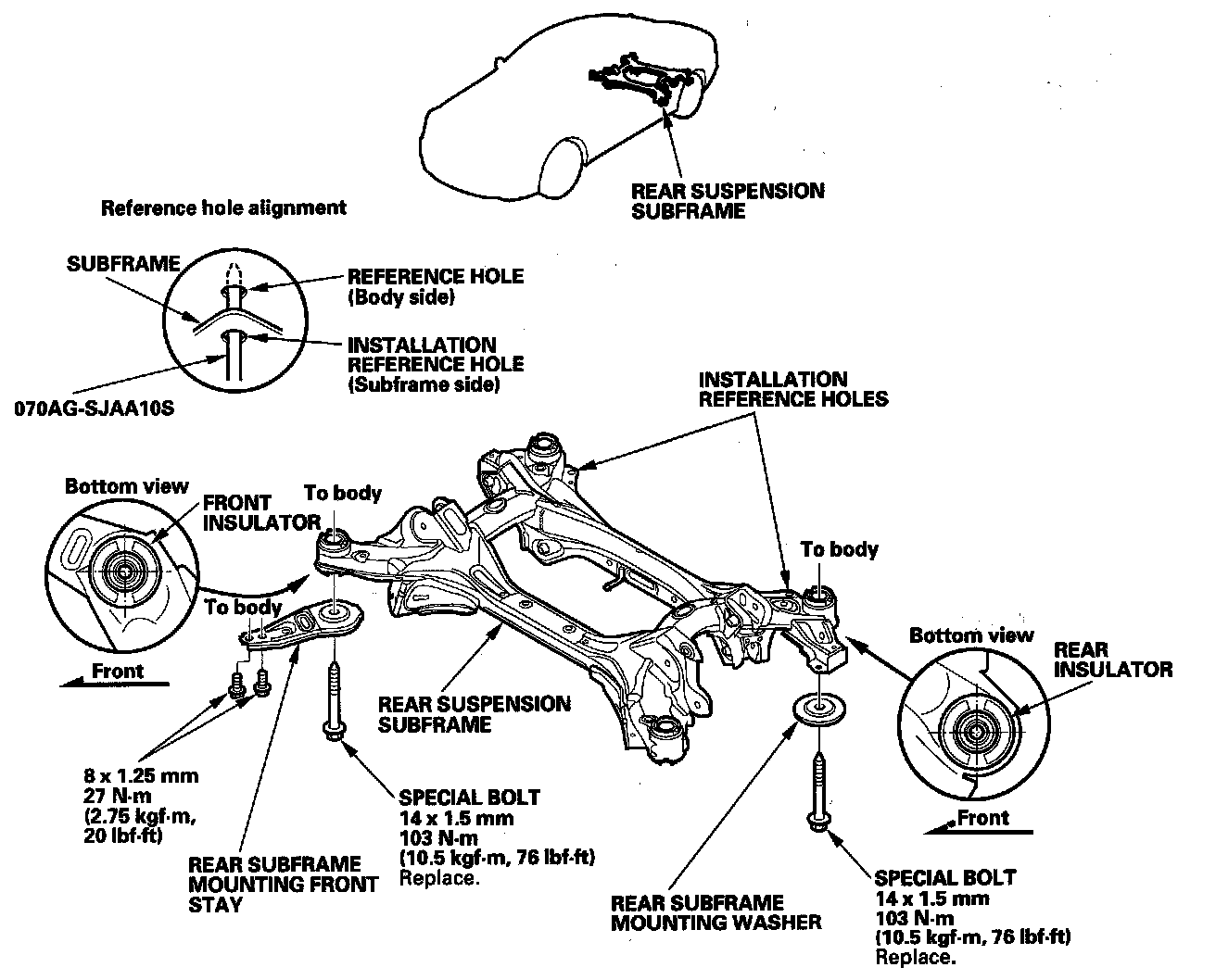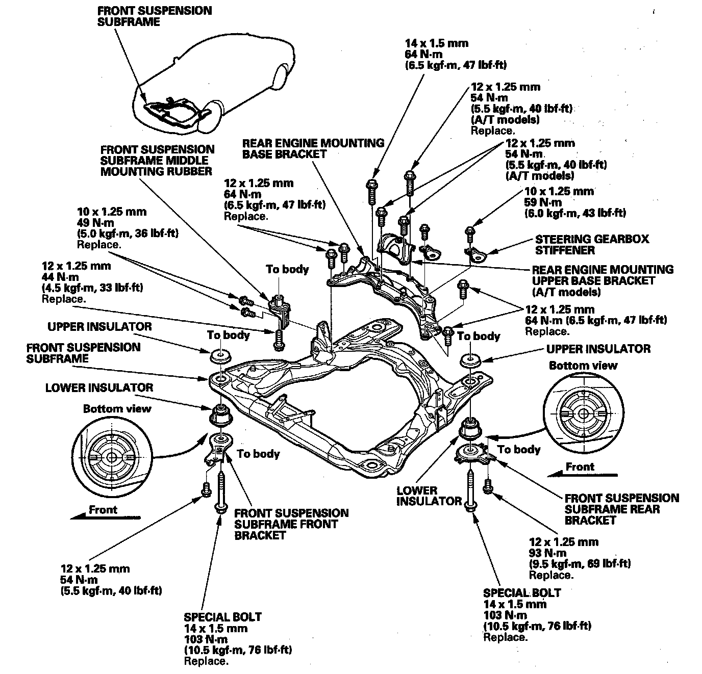 - After removing the subframe mounting bolts, be sure to replace them with new ones.