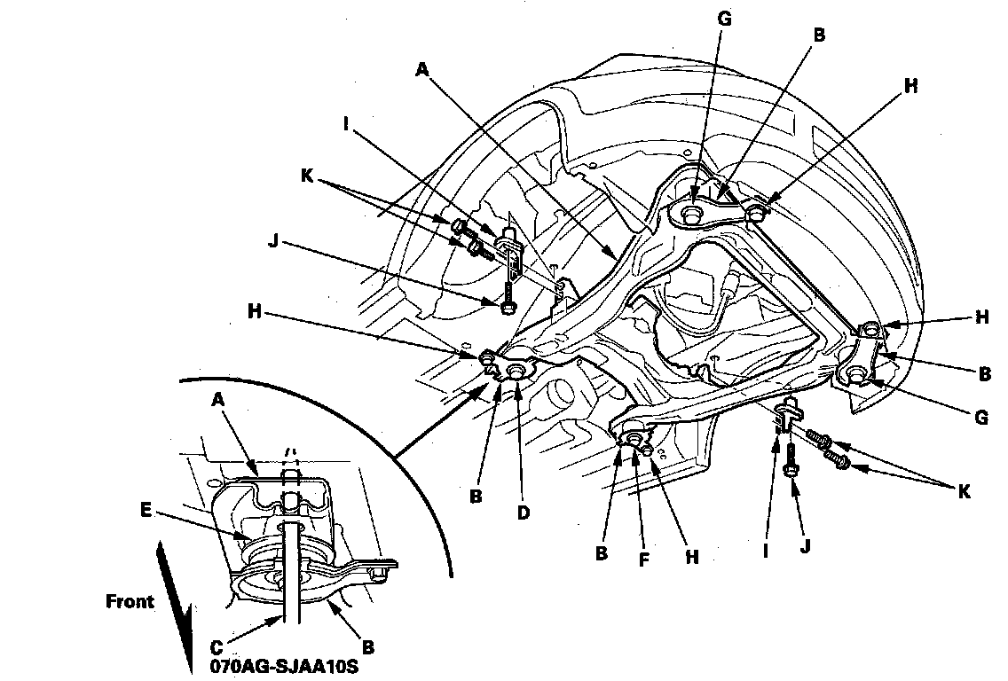 2. Set the front suspension subframe middle mounting rubbers (I) on both sides, and tighten the rubber mounting bolts (J) that secure the rubber to the body to the specified torque values. And tighten both subframe mounting bolts (K) securing the subframe and the rubber to the specified torque values.