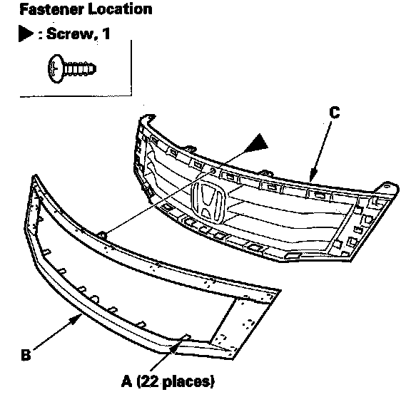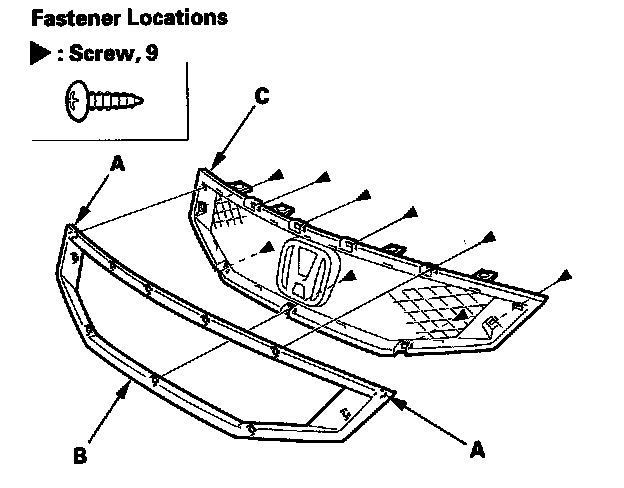 2. From behind the grille, remove the screw, and pry up the hooks (22 places) (A) by using a flat-tip screwdriver wrapped with protective tape, then remove the front grille molding (B) from the front grille base (C).