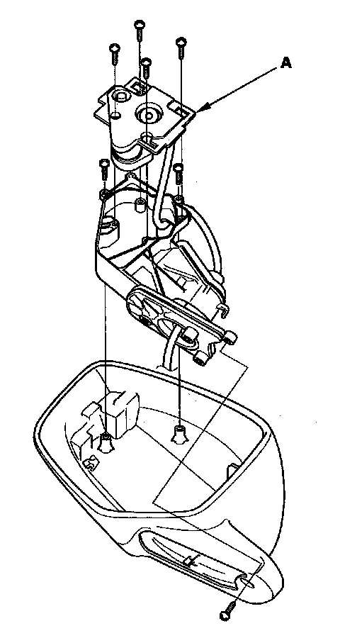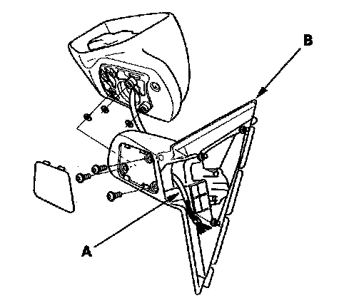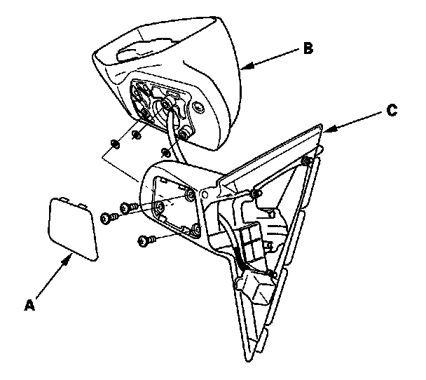 8. Remove the three screws, and separate the mirror housing (B) from the bracket (C).