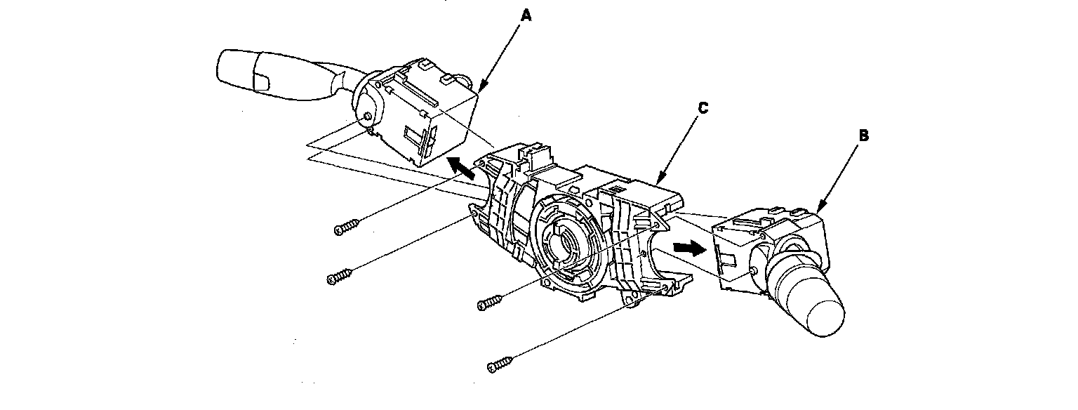 4. Remove the combination light switch (A) and the wiper/washer switch (B) from the combination switch body assembly (C).