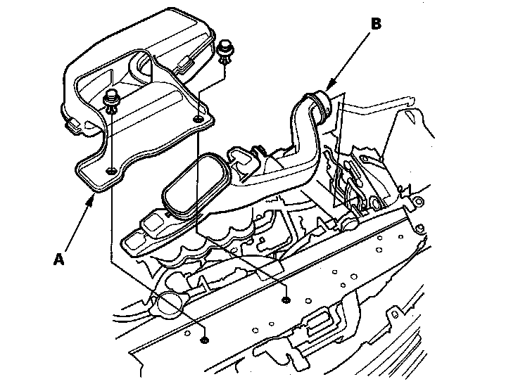 12. Remove the positive crankcase ventilation (PCV) hose (A) from the intake manifold, then remove the intake manifold (B).