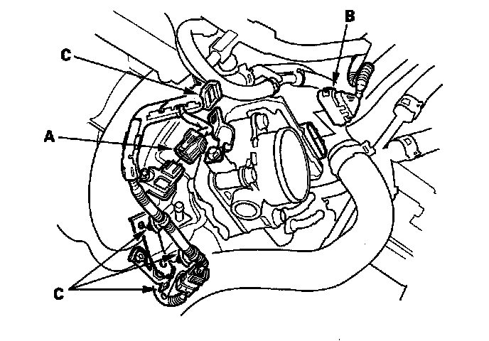 9. Disconnect the manifold absolute pressure (MAP) sensor connector (A) and throttle actuator connector (B), then remove the wire harness clamps (C).