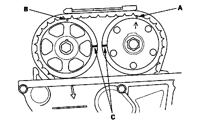 6. Set the No. 1 piston at top dead center (TDC). The punch mark (A) on the variable valve timing control (VTC) actuator and the punch mark (B) on the exhaust camshaft sprocket should be at the top. Align the TDC marks (C) on the VTC actuator and the exhaust camshaft sprocket.