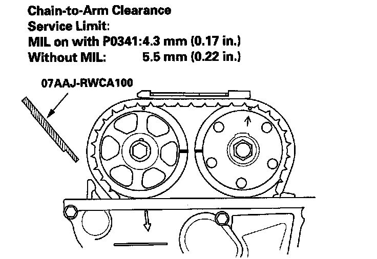7. Measure the clearance between the cam chain and the tensioner arm with the cam chain inspection gauge.