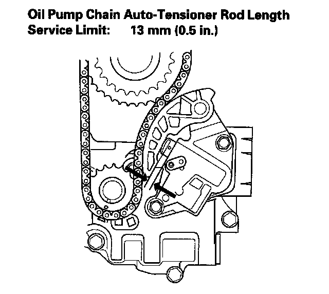 13. If the length is over the service limit, replace the oil pump chain. When replacing, check the teeth on the crankshaft sprocket and oil pump sprocket for wear and damage. If any of them are worn or damaged, replace if necessary.