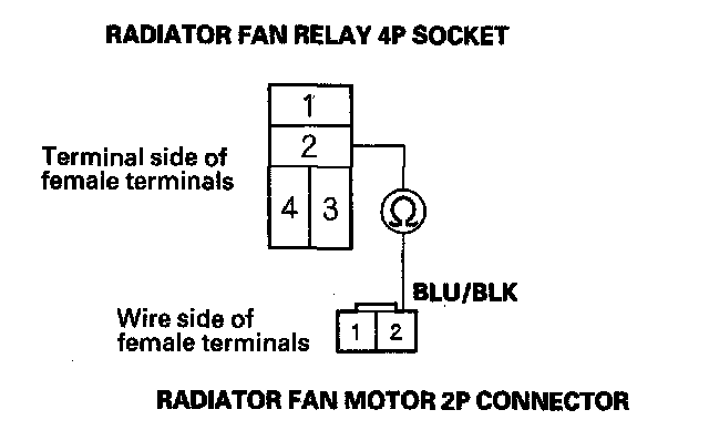 7. Check for continuity between radiator fan relay 4P socket terminal No. 2 and radiator fan motor 2P connector terminal No. 2.