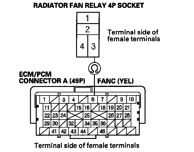 15. Disconnect ECM/PCM connector A (49P), then check for continuity between radiator fan relay 4P socket terminal No. 3 and ECM/PCM connector terminal A6.